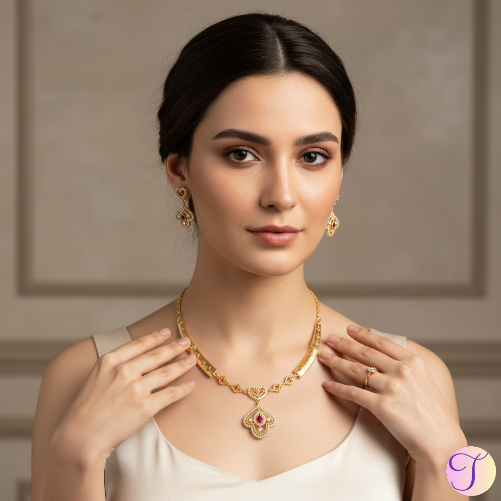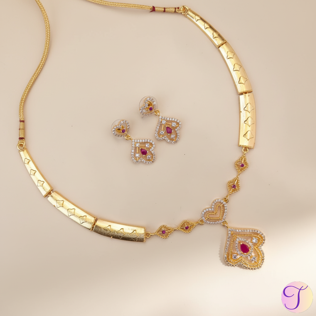 Crafted with precision and detail, the necklace features high-grade gold-polished American Diamonds (AD) that closely mimic the brilliance of real diamonds. Each stone is carefully set to enhance light reflection, creating a dazzling shine that draws compliments from every angle. The matching earrings complete the look with just the right amount of glamour.