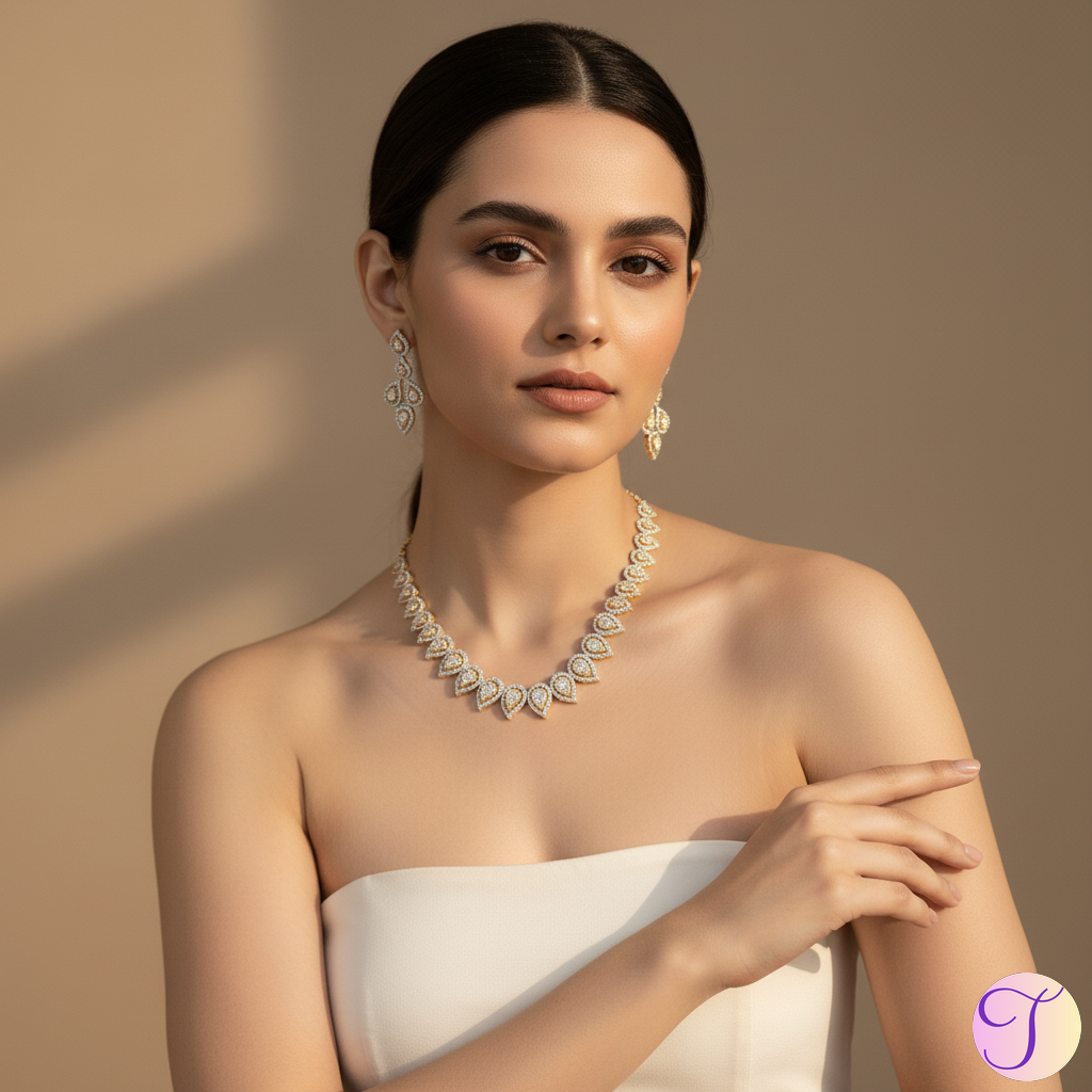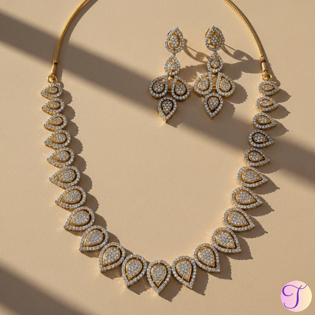 Crafted with precision and detail, the necklace features high-grade gold-polished American Diamonds (AD) that closely mimic the brilliance of real diamonds. Each stone is carefully set to enhance light reflection, creating a dazzling shine that draws compliments from every angle. The matching earrings complete the look with just the right amount of glamour.