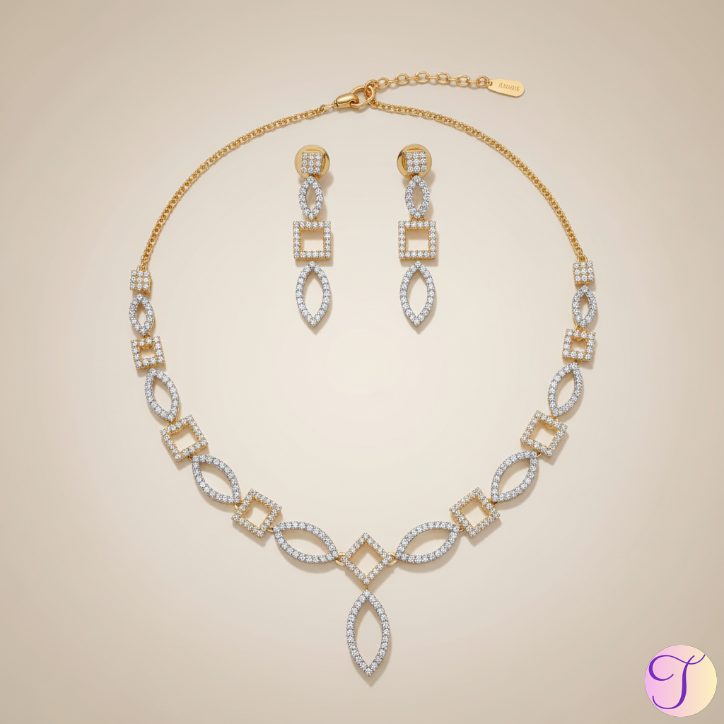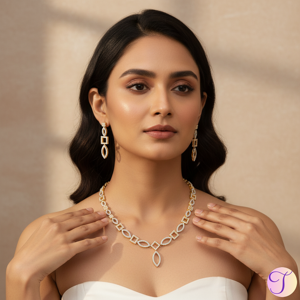 Crafted with precision and detail, the necklace features high-grade gold-polished American Diamonds (AD) that closely mimic the brilliance of real diamonds. Each stone is carefully set to enhance light reflection, creating a dazzling shine that draws compliments from every angle. The matching earrings complete the look with just the right amount of glamour.