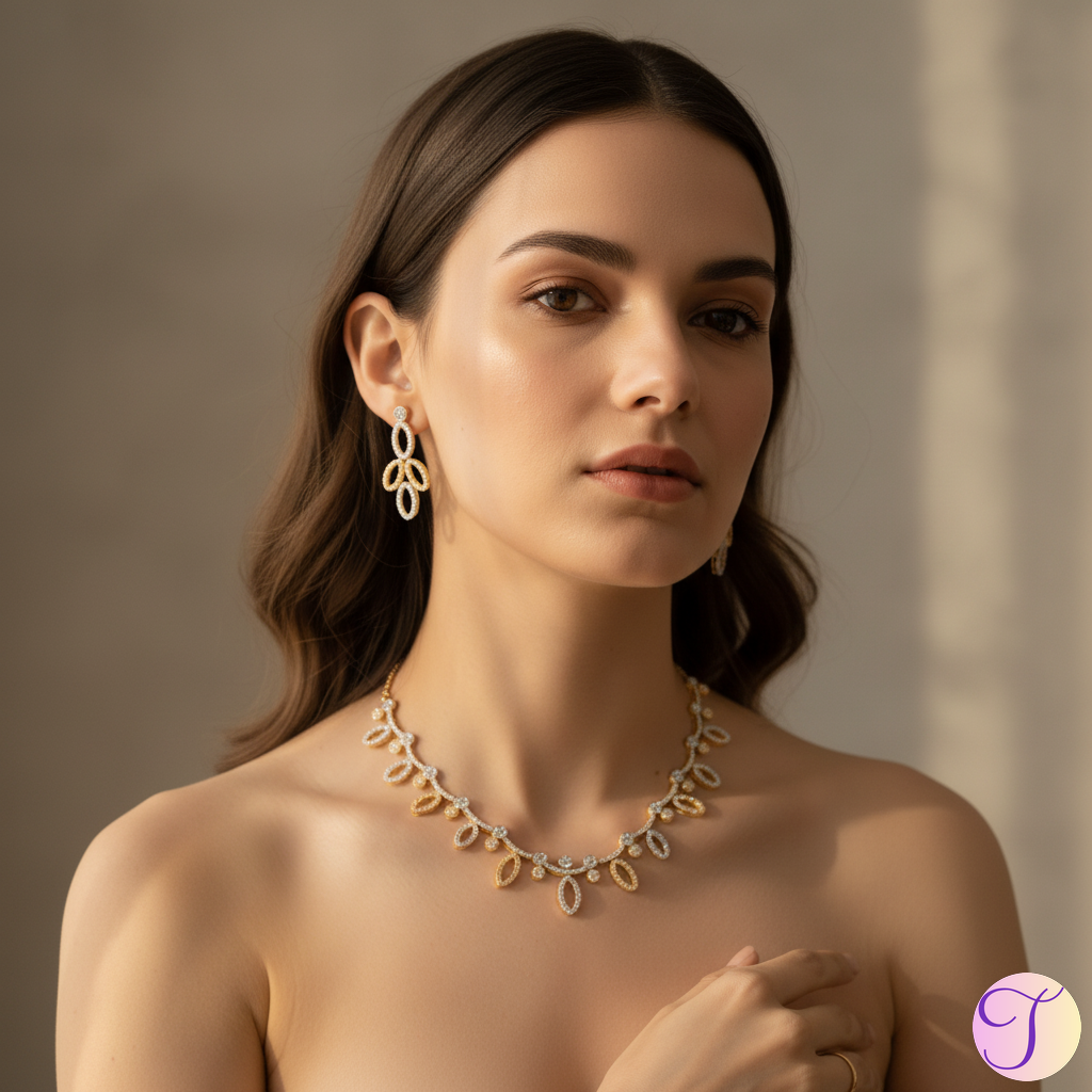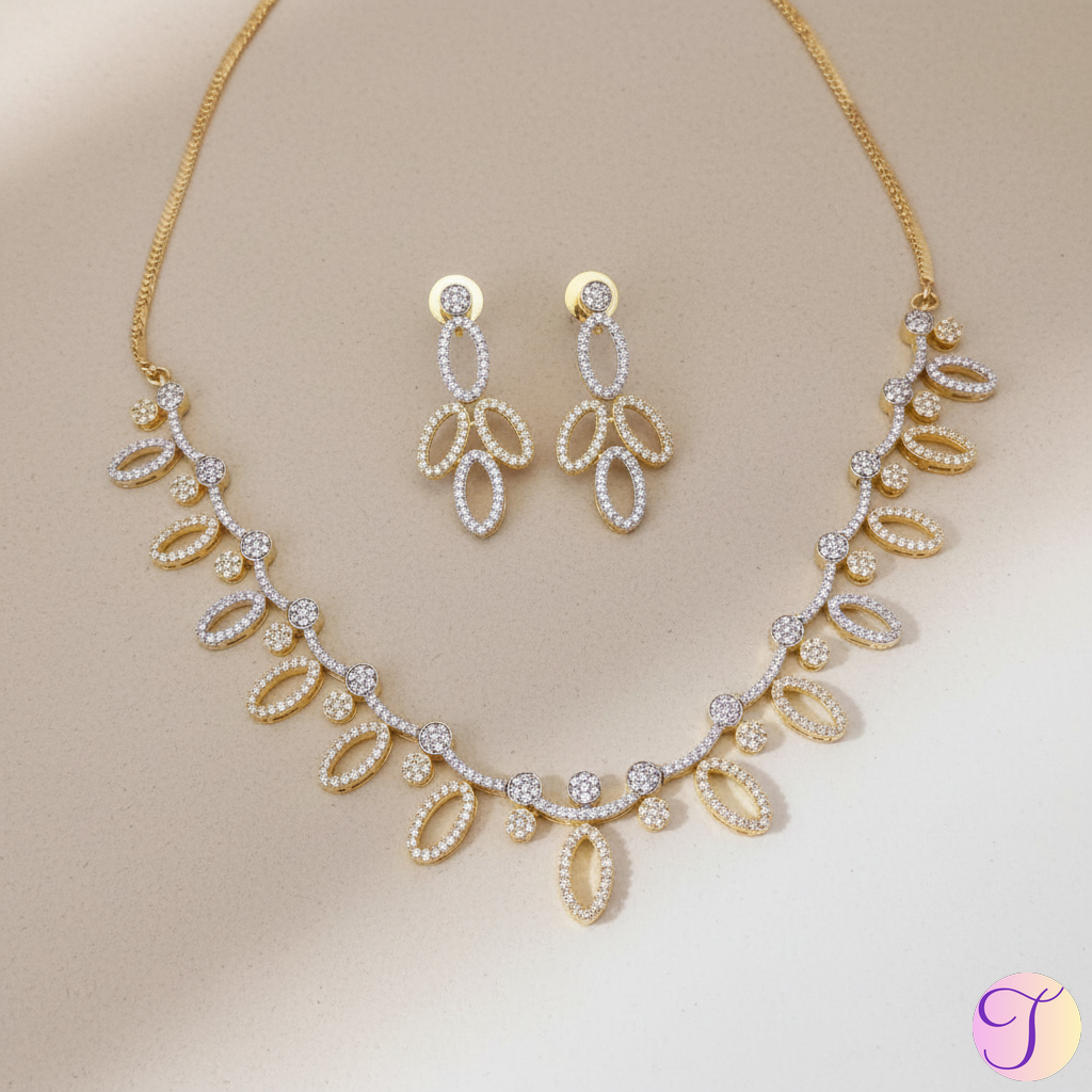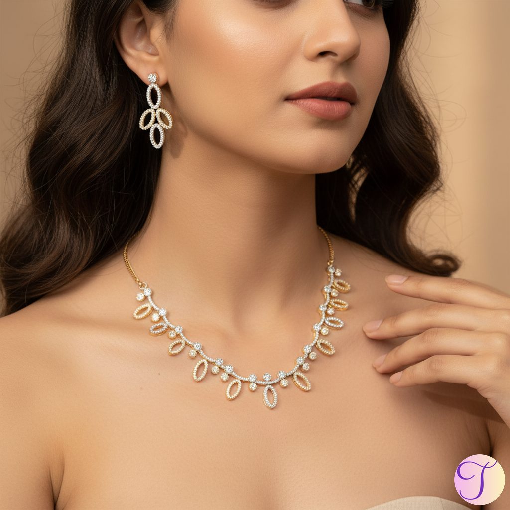 Crafted with precision and detail, the necklace features high-grade gold-polished American Diamonds (AD) that closely mimic the brilliance of real diamonds. Each stone is carefully set to enhance light reflection, creating a dazzling shine that draws compliments from every angle. The matching earrings complete the look with just the right amount of glamour.