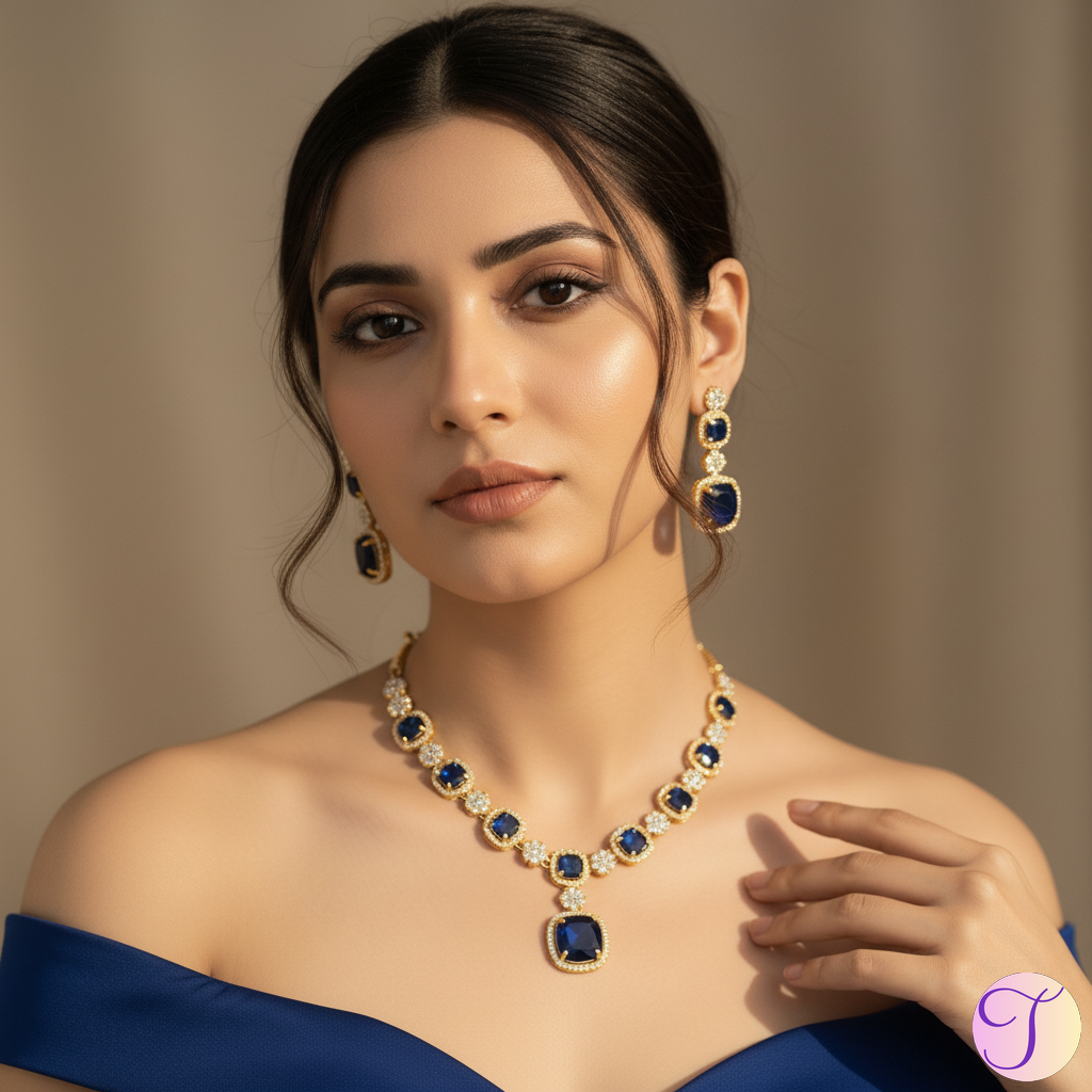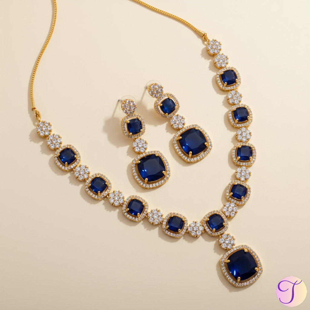 Sapphire Serenade American Diamond Golden Necklace Set