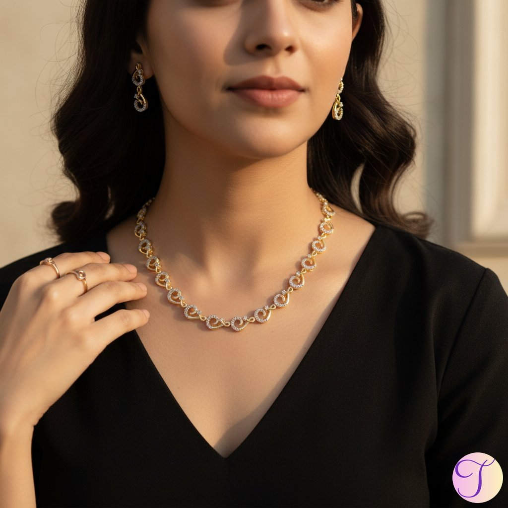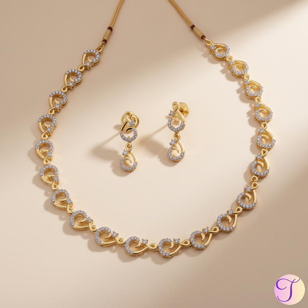 Crafted with precision and detail, the necklace features high-grade gold-polished American Diamonds (AD) that closely mimic the brilliance of real diamonds. Each stone is carefully set to enhance light reflection, creating a dazzling shine that draws compliments from every angle. The matching earrings complete the look with just the right amount of glamour.