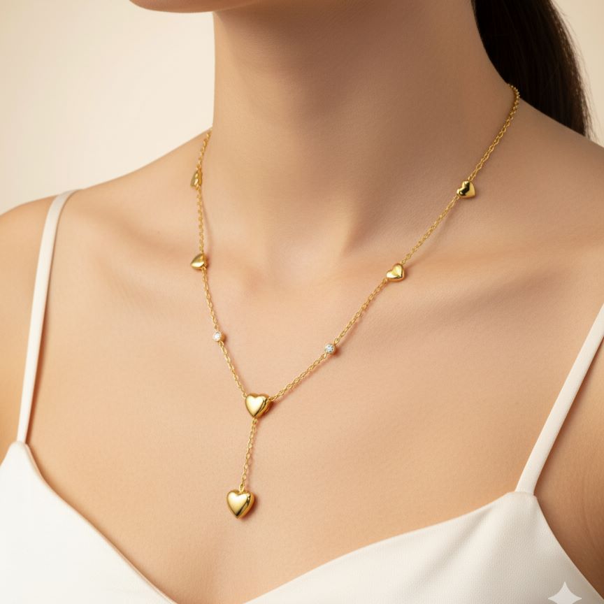 A Celebration of Affection and Feminine Flow. This luxury pendant necklace is inspired by the universal symbol of the heart, reimagined with contemporary fluidity. The timeless design incorporates smooth, high-polish heart pendants spaced along a delicate chain, culminating in an elegant, off-center lariat drop. This intentional asymmetry, punctuated by brilliant clear zirconia stones, adds a dynamic and flattering movement, making it a distinctly elegant jewellery piece. It’s a subtle yet powerful declaration of love and grace.