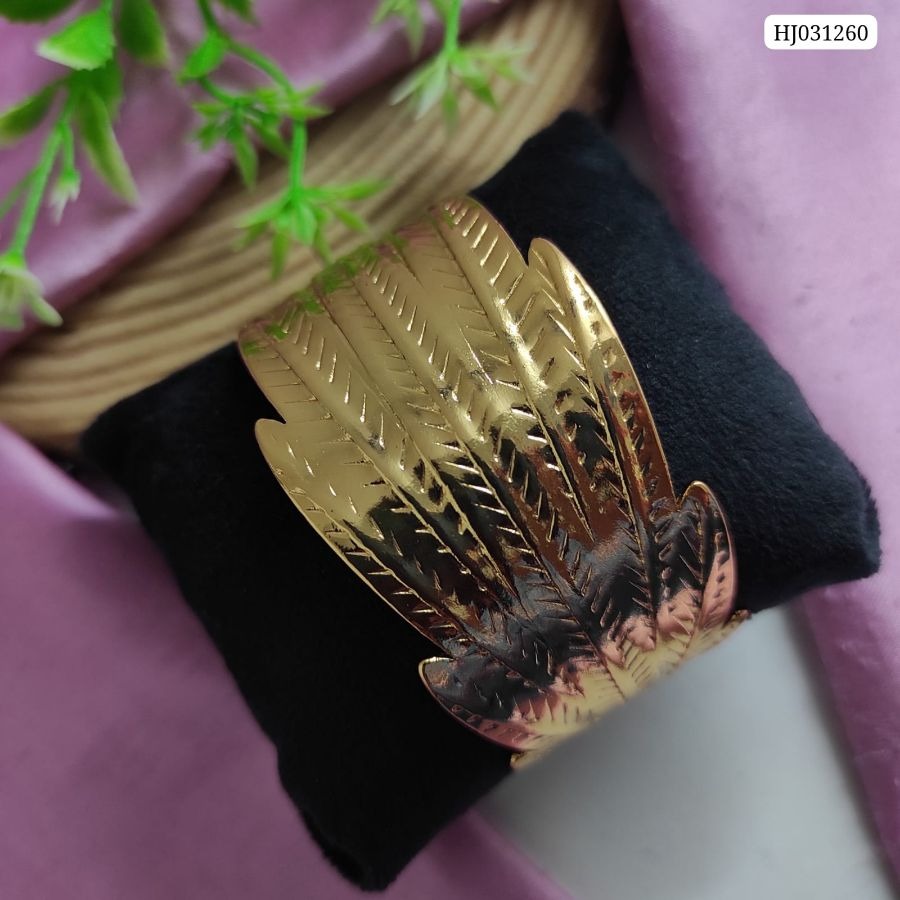 Crafted with an artistic leaf pattern, this kada exudes timeless charm and effortlessly blends traditional motifs with modern aesthetics. The intricately etched veining on each leaf section enhances its visual appeal, creating a textured look that catches the light beautifully. The wide, cuff-style design ensures a comfortable fit while making a striking impression.