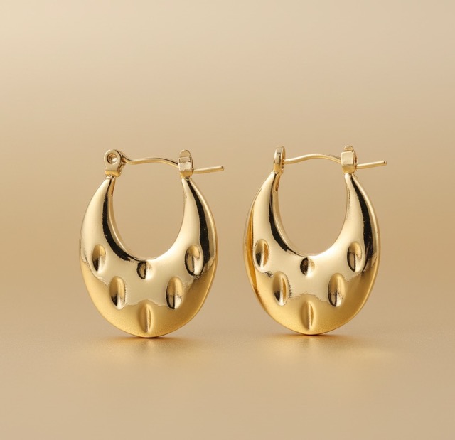 These striking women’s jewellery pieces feature a distinct, flattened oval shape, offering a modern take on classic Hoop Earrings. The most prominent visible feature is the rich, uniform gold-tone colour and the distinctive texture across the main body of the earring. The texture alternates between smooth, highly polished areas and sections showcasing an artisanal hammered or dappled motif, which beautifully catches and reflects light. This contrasting texture creates a premium, high-shine effect, ensuring a captivating sparkle with every movement.