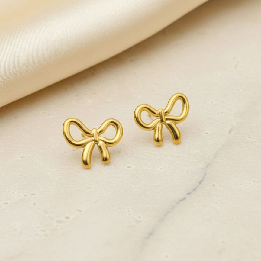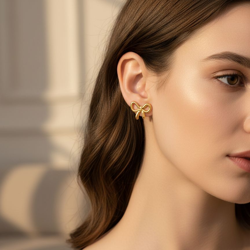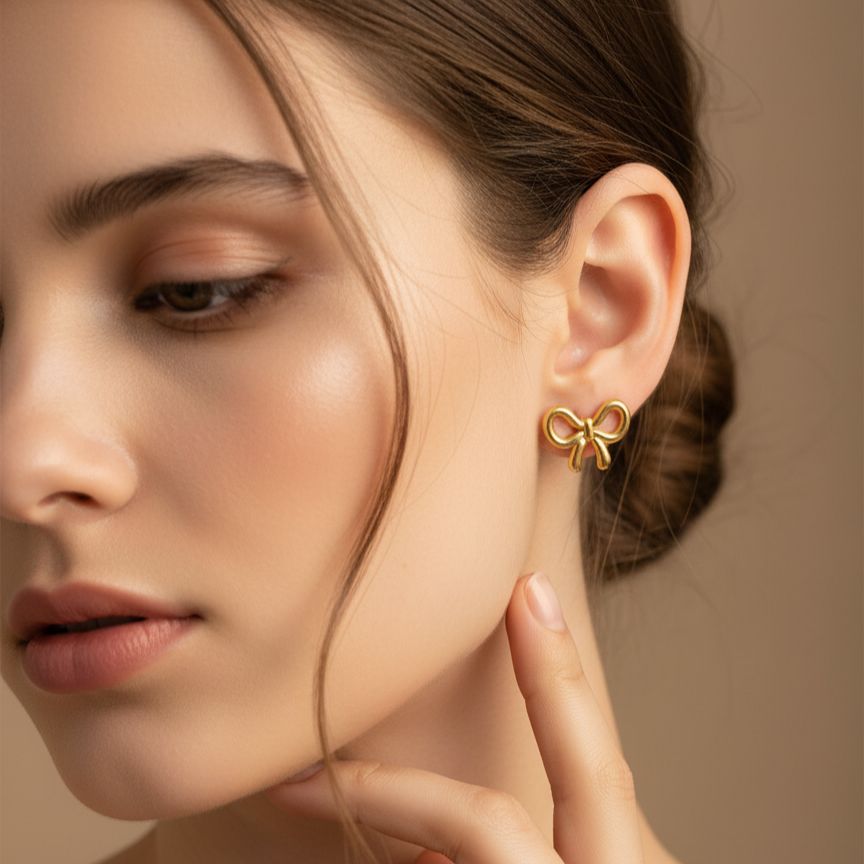 The Aura Bow Stud Earrings are inspired by the enduring grace and symbolic connection of a perfectly tied ribbon. Far from a simple accent, this design is a work of miniature sculpture, featuring a flowing, asymmetrical bow with delicately rounded loops and a tightly cinched knot. Every curve is intentional, catching the light to create an almost fluid appearance, a testament to modern design meeting classic sensibility. They are the ultimate expression of subtle power and enduring femininity.