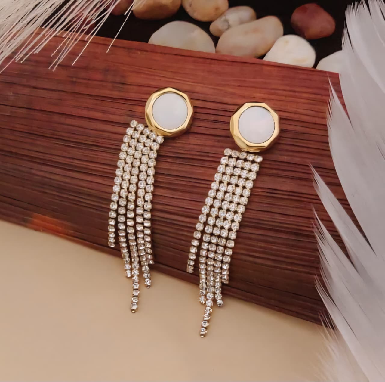 Crafted for the woman who commands attention, the Aura Waterfall Tassel Earrings draw their inspiration from the celestial phenomenon of a meteor shower—a brilliant, cascading light against a dark sky. The design begins with a polished, octagonal mother-of-pearl stud, framed in lustrous gold, offering a hint of natural, iridescent elegance. From this sophisticated anchor, multiple strands of precision-cut cubic zirconia descend in a layered, graduated “waterfall,” creating a flow of light that mimics the fluidity of fabric. This intricate, dynamic structure ensures a captivating sparkle from every angle.