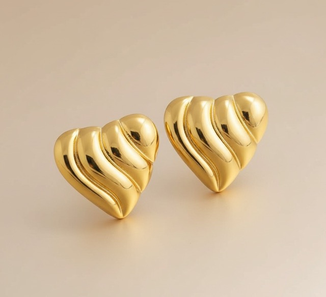 The Aurum Ripple Heart Stud Earrings feature a beautiful, softly contoured heart motif, lending a classic yet contemporary feel to this charming design. The surface is defined by a mesmerizing, organic ripple or wave texture, which expertly catches and reflects light to amplify the premium shine, creating a subtle yet impactful play of shadow and brilliance. The warm, luminous golden hue adds a touch of aspirational elegance, perfectly complementing any skin tone.