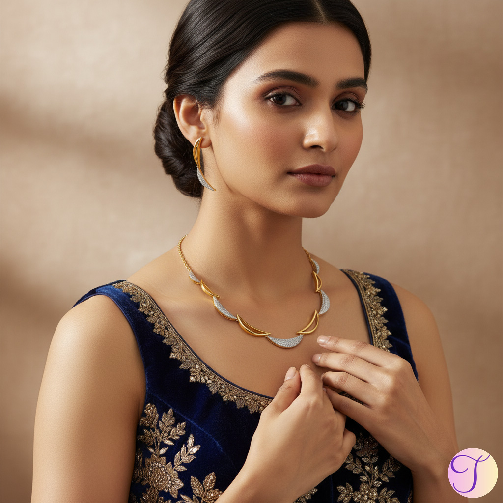 Precision and Luxury are hallmarks of the Azure Crescent set. Each crescent is individually cast and meticulously assembled to form a fluid, articulate chain that drapes beautifully. The piece undergoes a superior premium gold polish, ensuring a rich, warm hue that mimics fine gold. The brilliant-cut AD jewellery stones are micro-paved by expert artisans, guaranteeing maximum fire and a secured setting, delivering the quintessential sparkle expected of a luxury necklace set.
