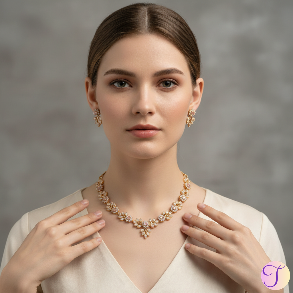 Crafted with precision and detail, the necklace features high-grade gold-polished American Diamonds (AD) that closely mimic the brilliance of real diamonds. Each stone is carefully set to enhance light reflection, creating a dazzling shine that draws compliments from every angle. The matching earrings complete the look with just the right amount of glamour.