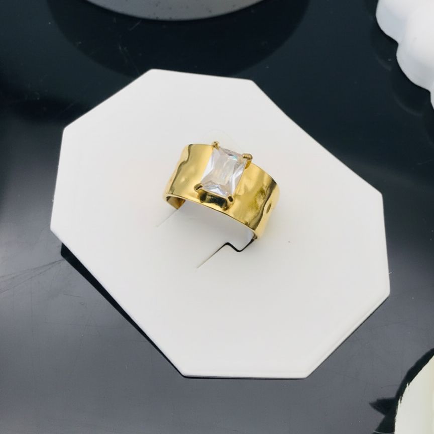 The Crystal Luxe Anti-Tarnish Wide Band Statement Ring is designed for women who love effortless glamour with a modern touch. The ring showcases a broad, smooth gold-toned band that instantly stands out, paired with a large clear rectangular crystal at the center. The high-polish finish and clean lines give it a luxurious, contemporary feel. With its anti-tarnish coating, this ring maintains its shine and brilliance even with frequent wear, making it ideal for everyday elegance.