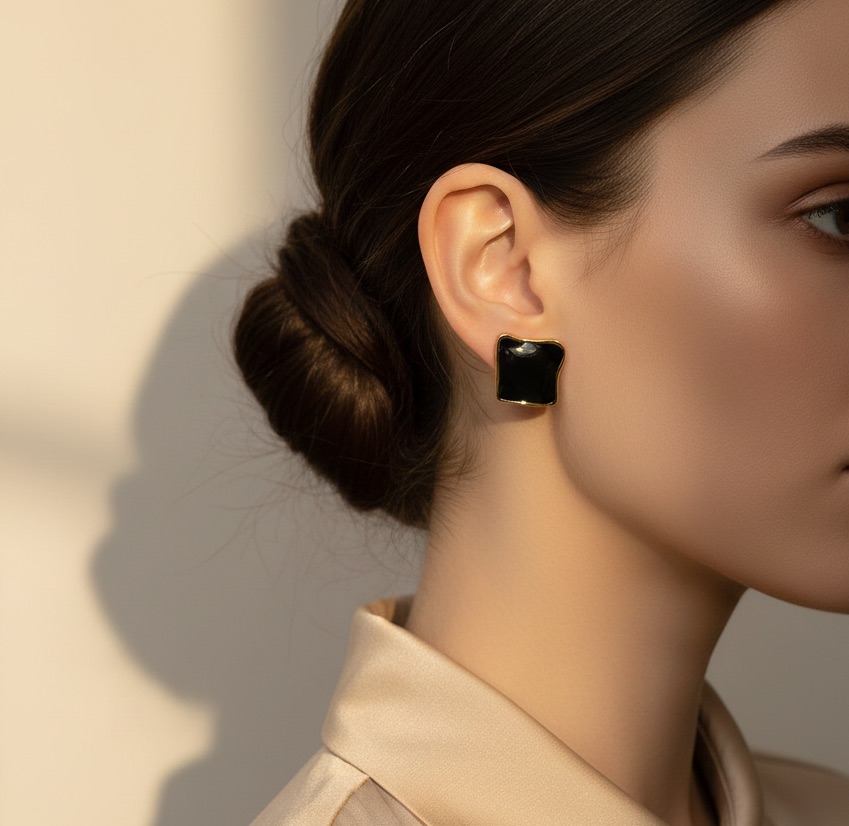 The Ebony Chic Stud Earrings make an immediate statement of refined elegance. These captivating earrings feature a distinct, softly rounded square silhouette, enclosed by a smooth, high-polish golden-tone frame. The captivating centerpiece displays a deep, solid jet-black enamel colour with a glossy texture, giving the earrings a luxurious depth and a beautiful, enduring shine. The vibrant contrast between the striking black and the radiant golden border highlights the unique, curved motif of the design.