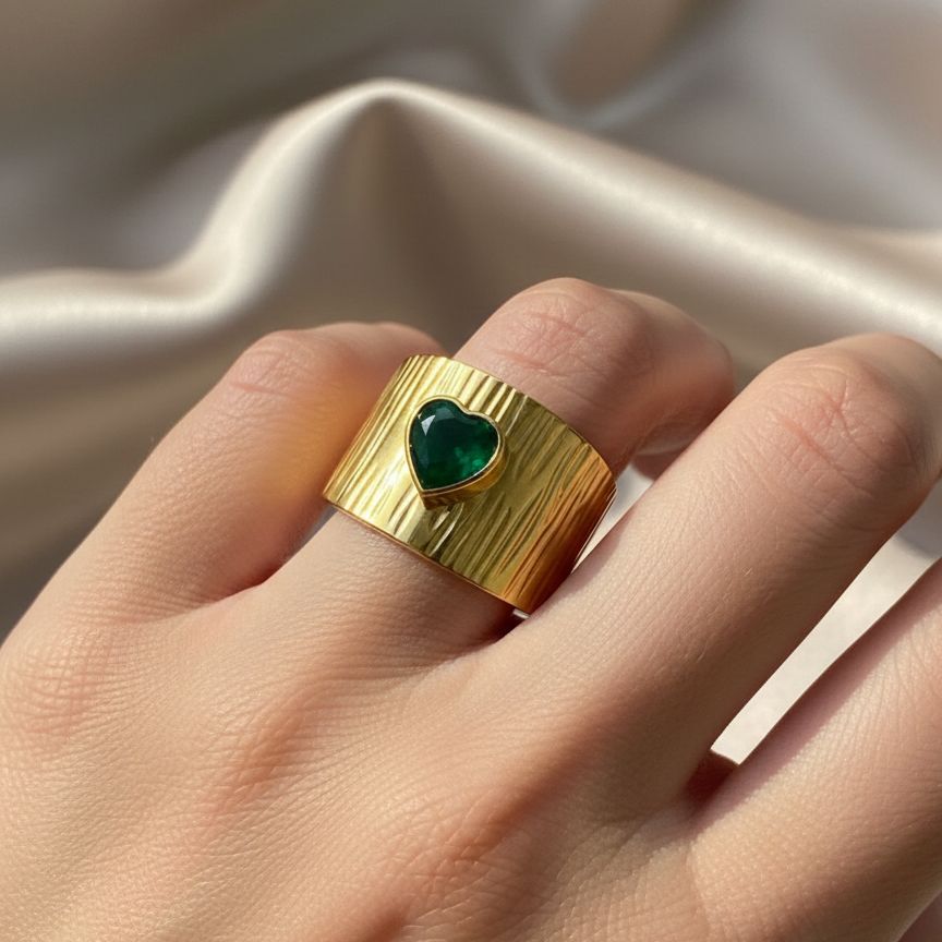 Crafted with precision, the ring features a polished interior for comfortable all-day wear and a hypoallergenic finish suited for sensitive skin. The textured exterior enhances the richness of the gold tone, while the green heart stone brings a pop of vibrant color—ideal for styling with everyday outfits or statement looks. Its bold yet elegant structure makes it a standout choice for women who appreciate unique, expressive jewellery.