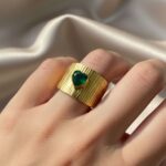 The Emerald Heart Anti-Tarnish Textured Gold Ring blends expressive style with refined femininity. Its wide gold-toned band showcases a beautifully textured surface that adds depth and character to the design. At the center rests a vivid emerald-green heart-shaped stone, creating a captivating focal point that reflects both charm and confidence. With its anti-tarnish finish, the ring maintains its shine and smooth appearance even with regular wear.