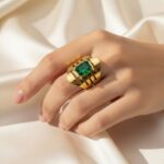 The Emerald Royale Anti-Tarnish Statement Cutout Ring blends bold contemporary design with rich, feminine sophistication. The wide gold-toned band features sleek horizontal cutouts, creating a sculpted, modern look that feels effortlessly stylish. At the center rests a vivid emerald-green rectangular stone, adding a vibrant pop of color and forming a stunning focal point. With its anti-tarnish finish, this ring maintains its shine and smooth polish even with frequent wear.