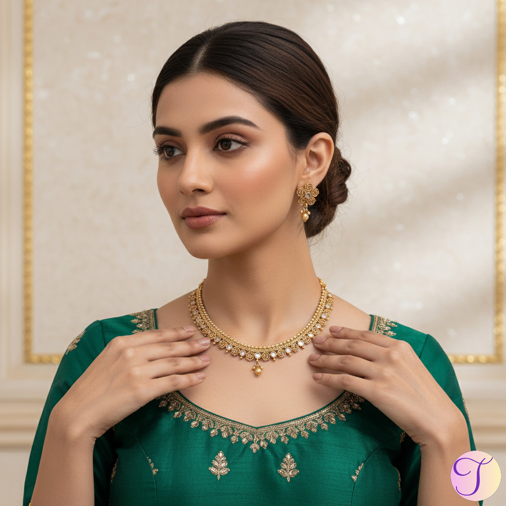 Elevate your festive elegance with a luxury necklace set designed to command attention. Whether it’s a grand wedding, a sangeet, or an important cultural event, this Rajwadi jewellery piece is perfectly scaled to complement traditional and contemporary Indian attire. Its choker-style fit is flattering and modern, while the intricate work keeps it eternally classic. Pair it with a silk saree or a lehenga for a truly majestic presentation.