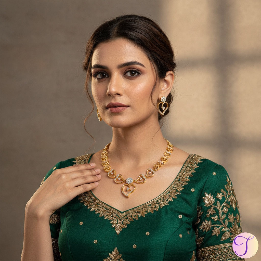 The Definitive Statement Piece. This opulent elegant jewellery set is destined for your most cherished events. Whether complementing a traditional wedding trousseau, celebrating an important milestone, or adding a final flourish to a black-tie look, the Eternal Hearts Radiance Necklace Set offers unparalleled versatility and glamour. It is an investment in your festive elegance, delivering high-impact style without overpowering your ensemble.