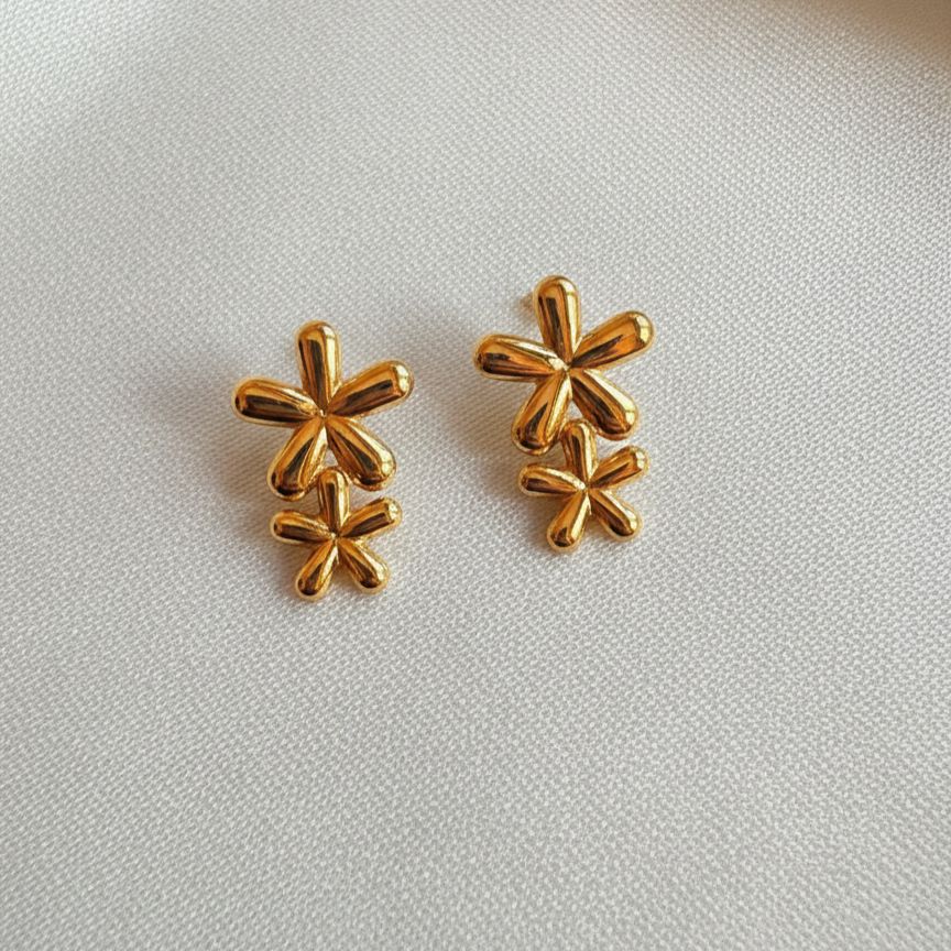 These floral drop earrings feature two polished flowers stacked to create a sophisticated layered look. Their smooth, reflective surface enhances the minimalist design, making them a versatile accessory for any outfit. The compact size ensures comfortable, everyday wear while maintaining a modern aesthetic.