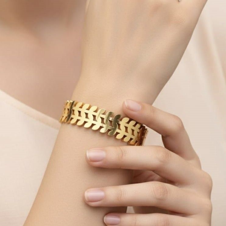 Crafted with precision, each leaf link is smoothly curved for a comfortable fit and a lightweight feel. The bracelet’s hypoallergenic build makes it suitable for sensitive skin, while its statement-worthy design pairs beautifully with both Indian and Western outfits. Whether worn with casual looks, officewear, or festive ensembles, it adds a polished, modern finish.