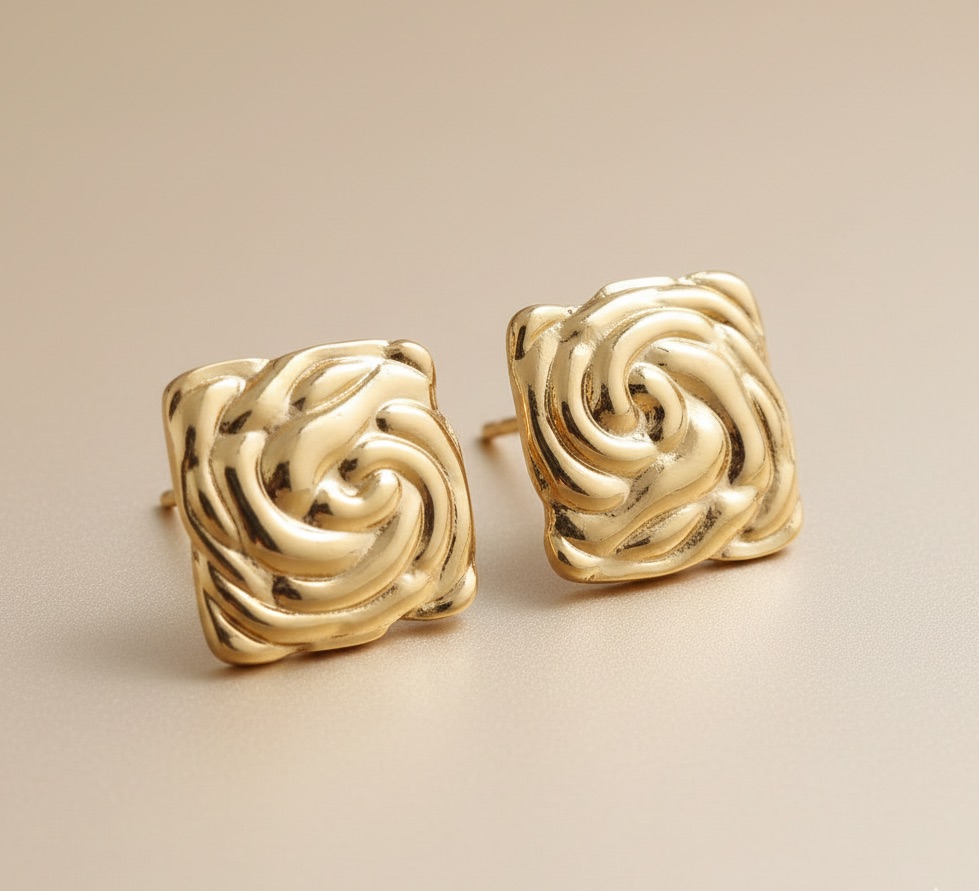 These striking stud earrings showcase a bold, square silhouette with softened edges, embodying a perfect balance of structure and movement. The surface of each earring features a captivating, high-relief vortex or swirl motif, creating a dynamic, almost sculptural texture that dramatically catches the light. The rich golden colour, intensified by the highly polished finish, lends a substantial and upscale feel to this piece of women’s jewellery.