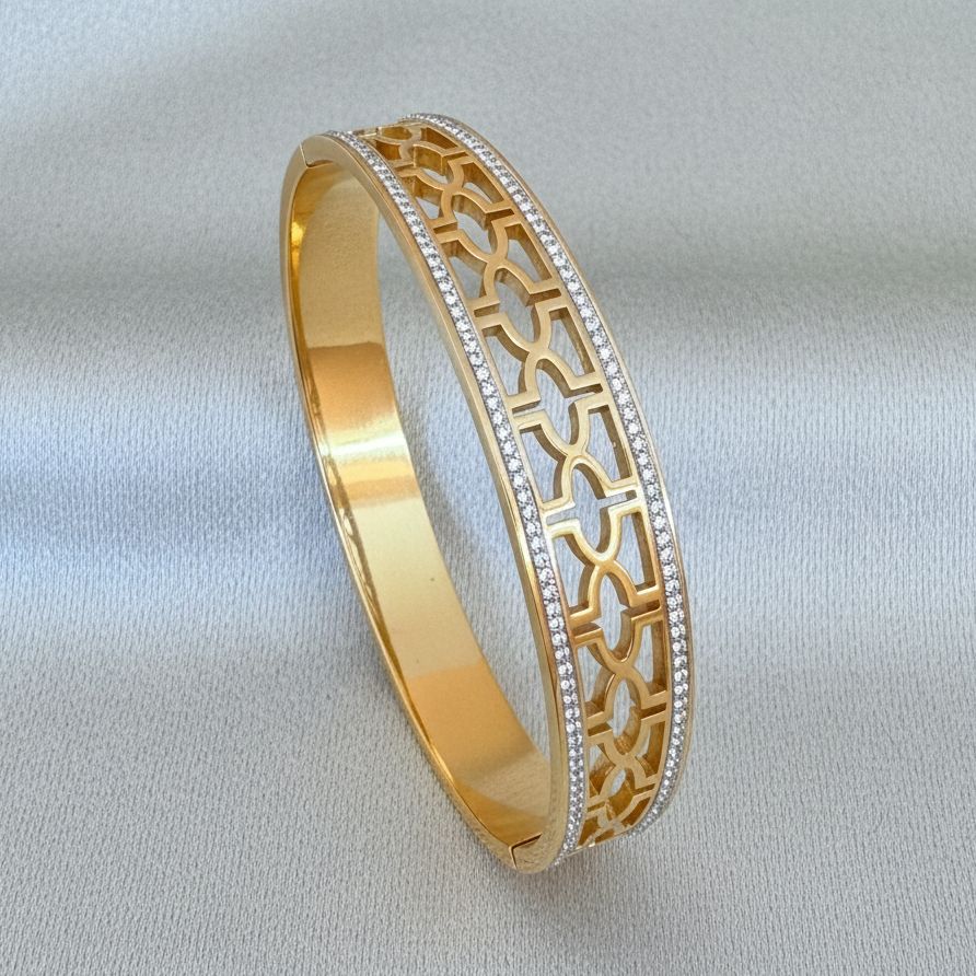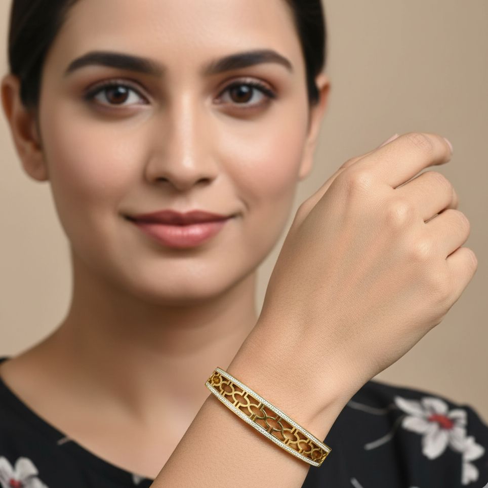 Experience the height of sophisticated design with this stunning lattice-work bracelet, a true masterpiece of premium jewellery. The central band features a repetitive, open-work geometric motif in a rich gold tone, flanked by two parallel rows of precision-set white stones that catch the light from every angle. This exquisite detailing creates a textured, multidimensional look that balances contemporary flair with classic elegance. Its seamless finish and ergonomic structure ensure a comfortable fit for daily wear, making it a versatile addition to both professional attire and festive ensembles.