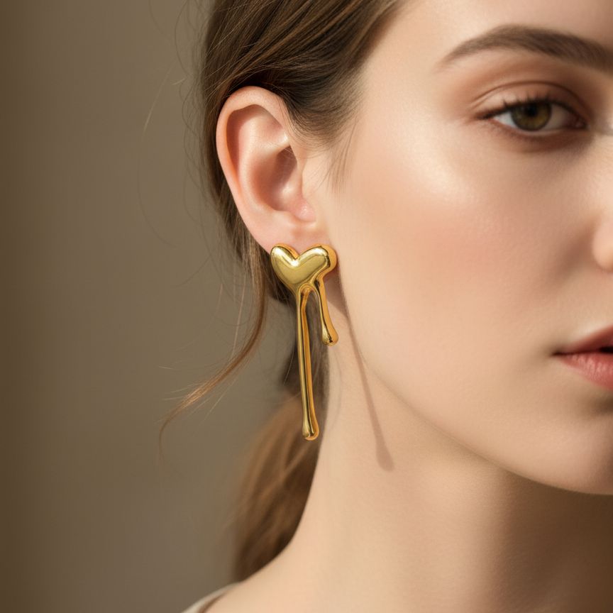 The design begins with a flawlessly puffed, voluptuous heart, giving it a soft, three-dimensional presence on the lobe. From this perfect form, golden trails appear to gracefully cascade, adding a dynamic, light-catching motion that draws the eye. The unique, drip-like silhouette is deliberately irregular, ensuring that no two perspectives look the same, much like the ever-changing light on liquid metal. This dramatic yet refined form offers a distinctive modern edge to the classic symbol of love.