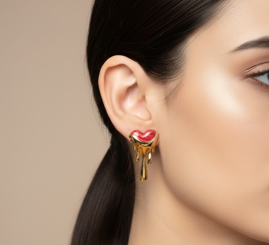 The Melting Heart Drop Earrings are a testament to modern artistry and playful elegance. The design features a sculpted, polished heart shape at the top, which is filled with a glossy, rich red enamel, giving it a vibrant pop of colour. Below the heart, the polished gold-toned surface appears to dramatically ‘melt’ and drip downwards into three distinct, elongated streams, creating a dynamic and eye-catching drop silhouette. This fusion of glossy red and highly reflective gold-tone results in a truly unique, contemporary motif.