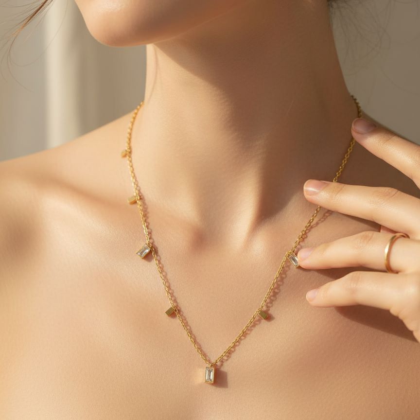 Drawing inspiration from contemporary architecture and the flow of light, the Radiant Stream Pendant Necklace presents a captivating rhythm. The design features a delicate yet sturdy chain punctuated by alternating stations: sleek, polished gold rectangles and sparkling, horizontally set emerald-cut simulated crystals. This thoughtful, balanced spacing creates a timeless design that gracefully catches the eye, offering an elevated twist on the classic bezel-set pendant. It’s a piece that speaks to sophistication and understated luxury.