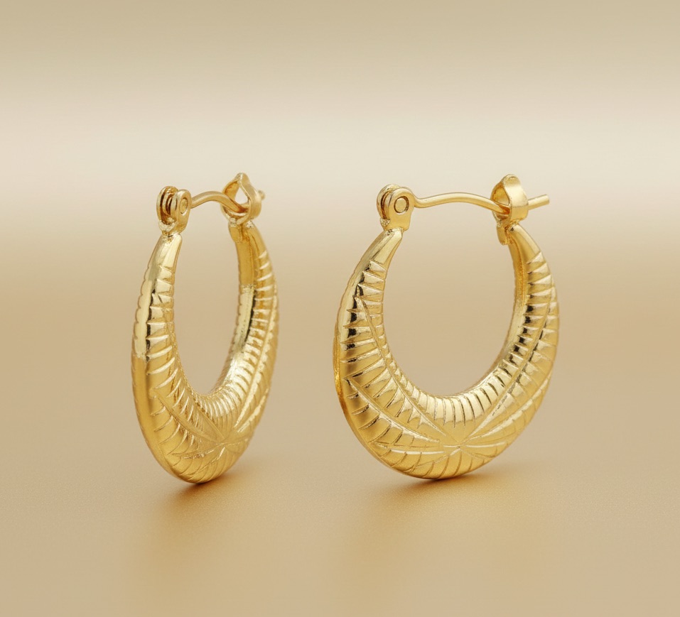 These striking circular hoops are defined by a broad, elegantly curved silhouette that embraces the earlobe, offering a chic and substantial look. The surface features an exquisite, deeply textured motif—a central, sweeping pattern that radiates outwards, giving the appearance of a sunburst or a regal crest etched into the polished golden finish. This intricate texture provides a rich visual depth and high-end feel, contrasting beautifully with the bright, premium shine of the metal. The secure closure visible at the top is a classic hinged snap-back post, ensuring comfortable wear and secure fastening for active daily life.