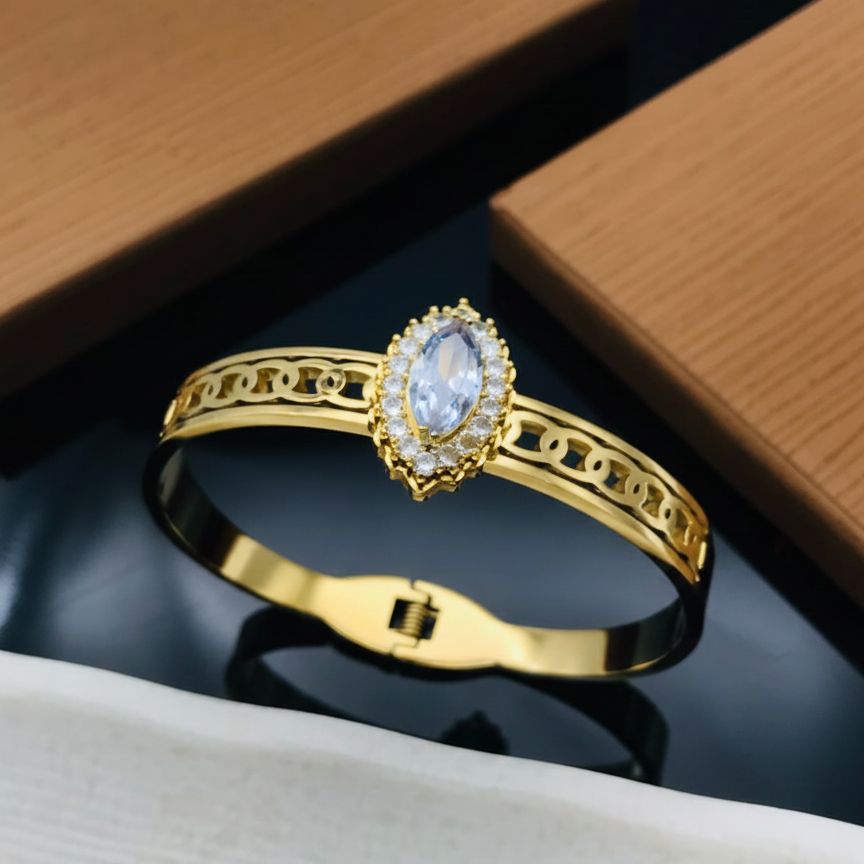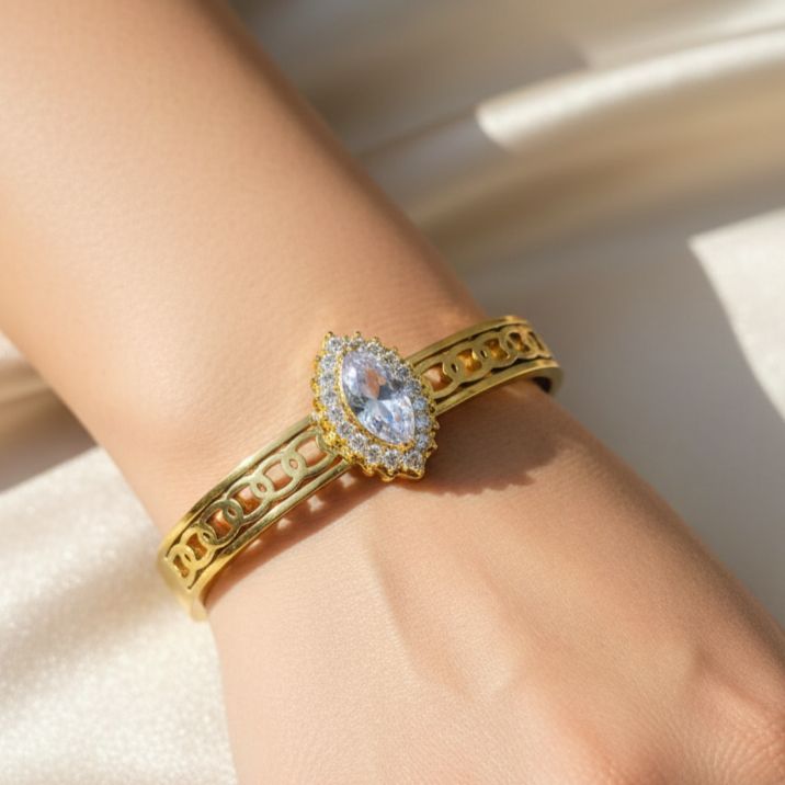 The Regal Marquise Anti-Tarnish Gold Crystal Bracelet captures timeless elegance through its beautifully structured design. The centerpiece showcases a marquise-shaped clear crystal surrounded by fine golden detailing, creating a radiant focal point that instantly elevates any look. The bracelet features a polished gold-toned finish with openwork cut-outs along the band, adding depth and sophistication. With its anti-tarnish coating, the shine remains long-lasting and fresh, making it ideal for everyday wear.