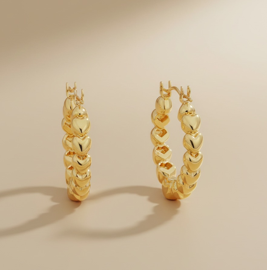 Showcasing a series of smoothly polished heart shapes, these hoop earrings bring a delicate yet bold statement to your jewelry collection. The repetitive heart motif forms a seamless circle that adds a touch of romantic elegance to any outfit. Their refined design balances both modern aesthetics and classic charm.