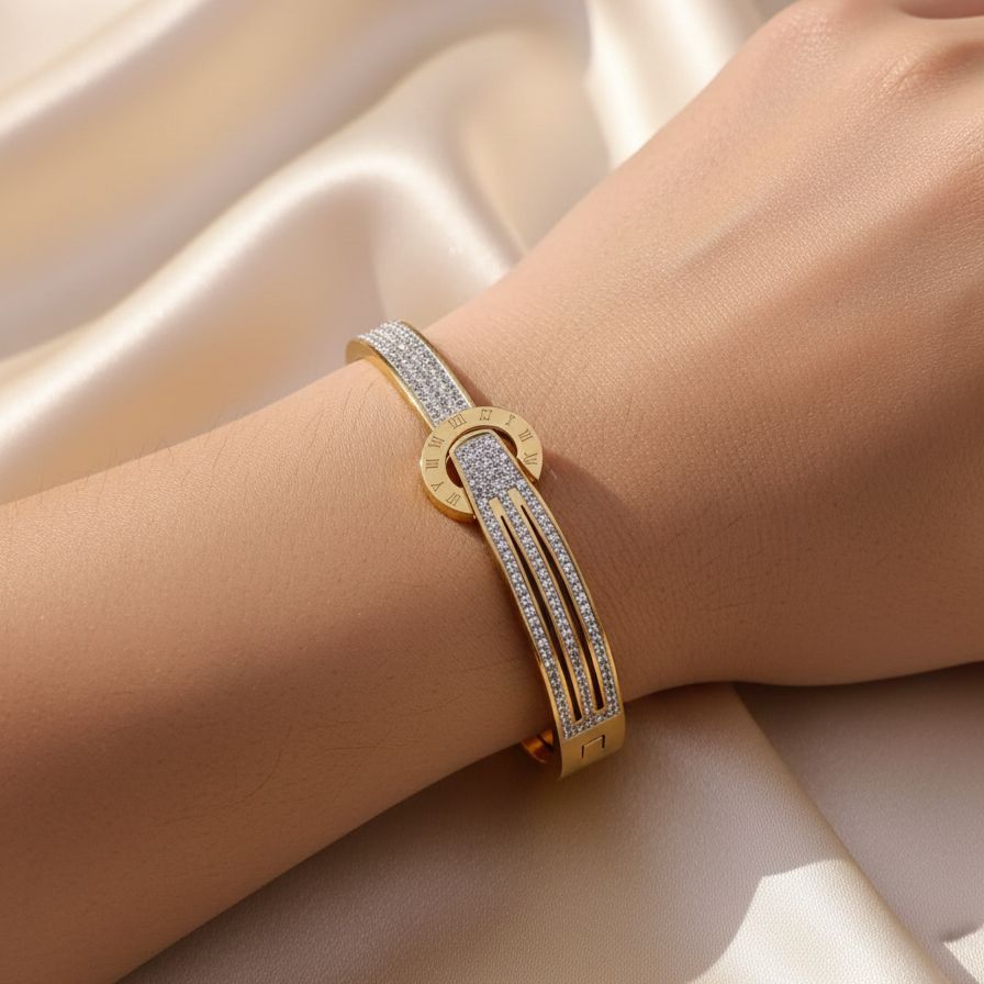 This Roman Halo Anti-Tarnish Crystal Bracelet brings together refined elegance and contemporary sparkle. The design features a polished gold-toned band with three parallel rows of clear crystals that add brilliance without overpowering the minimal structure. At the center sits a rounded Roman numeral engraved charm, creating a stylish focal point that enhances the bracelet’s modern aesthetic. With its long-lasting anti-tarnish finish, the bracelet stays radiant and fresh even with regular wear.