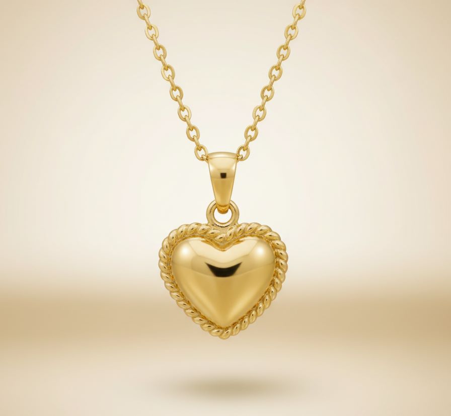 A Modern Take on Romance. The pendant transforms the classic heart motif into a sculptural work of art. Its central form is gently puffed and highly polished, contrasting exquisitely with the finely detailed rope texture that frames the perimeter. This elegant jewellery design captures the warmth and depth of affection, making it a sophisticated piece of luxury pendant wear that speaks volumes without uttering a word.