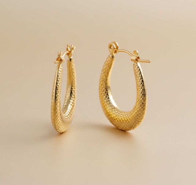 These elegant hoop earrings showcase a sophisticated, tapered U-shape, often referred to as a Creole style, giving them a distinct and gracefully curved silhouette. The entire surface is meticulously finished with a fine, textured, diamond-cut pattern that captures and reflects light beautifully, enhancing the rich gold-tone finish with an unparalleled premium shine. The absence of visible stones keeps the design pure and focused on the intricate metalwork. The closure appears to be a classic hinged hoop style, ensuring comfortable wear and a secure fit for daily use.