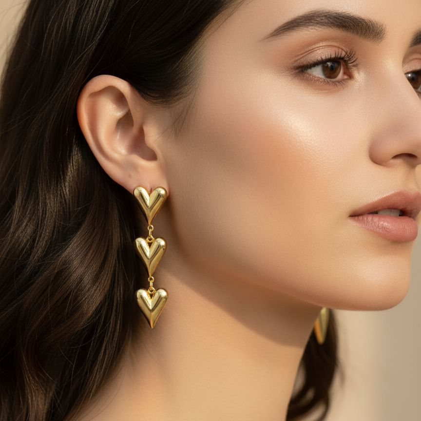 The Triple Heart Drop Earrings are more than just jewelry; they are wearable art inspired by the enduring flow and layers of affection. Designed for the woman who carries her style with quiet confidence, these earrings capture love in its most fluid and radiant form. They are a sophisticated update to the classic heart motif, offering a dynamic piece that moves gracefully with you.