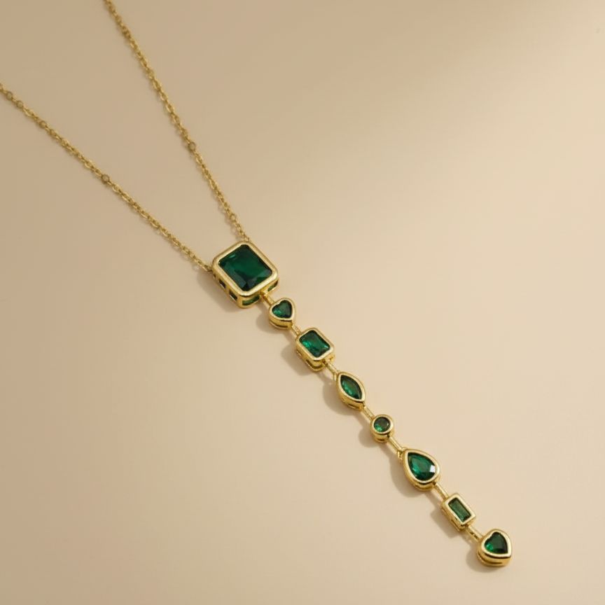 The Veridian Cascade draws inspiration from the art of architectural geometry and the captivating depth of natural emeralds. The luxury pendant begins with a prominent rectangular stone and transitions through a series of increasingly smaller, uniquely cut green gems—including marquise, oval, and teardrop shapes. This thoughtful, cascading arrangement creates a flattering vertical line, instantly elongating the wearer’s neckline with timeless design and brilliant light reflection.